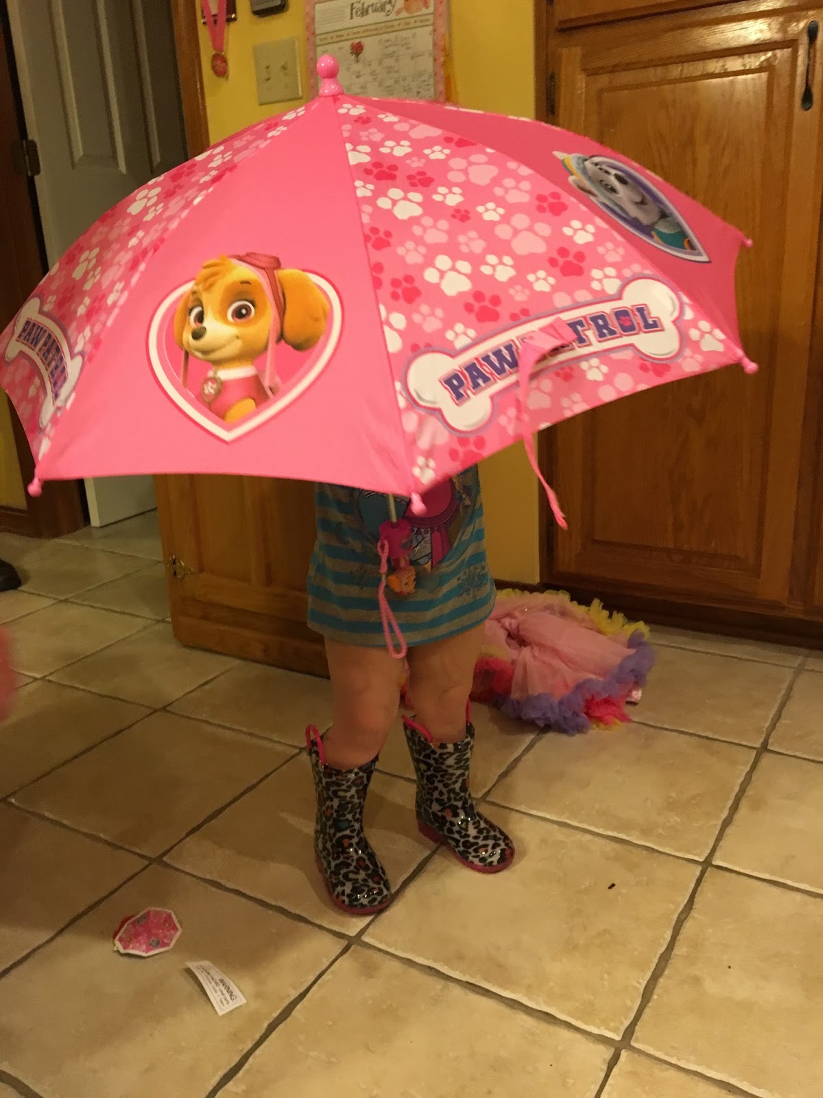My umbrella is so pretty! It's a pink Paw Patrol umbrella with Skye and Everest on it. I love it! And my rain boots and really neat. They're different colors and have really neat handles that make it easy for me to pull them on. I love my boots and umbrella! Thank you, thank you, thank you Aunt Stephanie!
